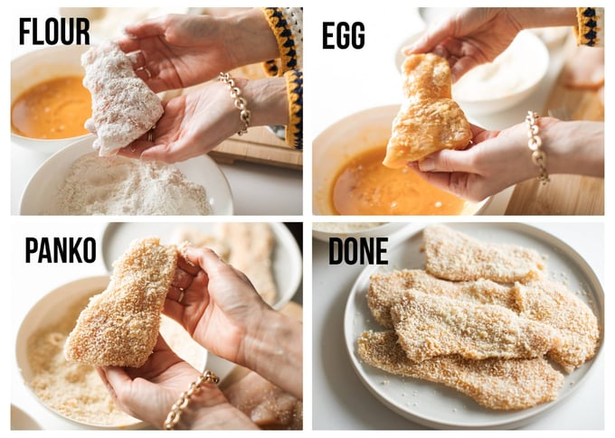 3. Breading: Dip the chicken in the flour; shake off excess. Dip into the egg mixture; let excess drip off. Press into the panko on both sides until coated.