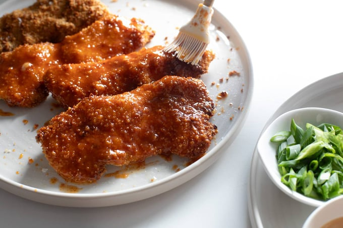 Crispy crunchy chicken with a gochujang butter sauce! My husband LOVES this (and me too) and we leave some pieces plain for our kids! Everybody wins!